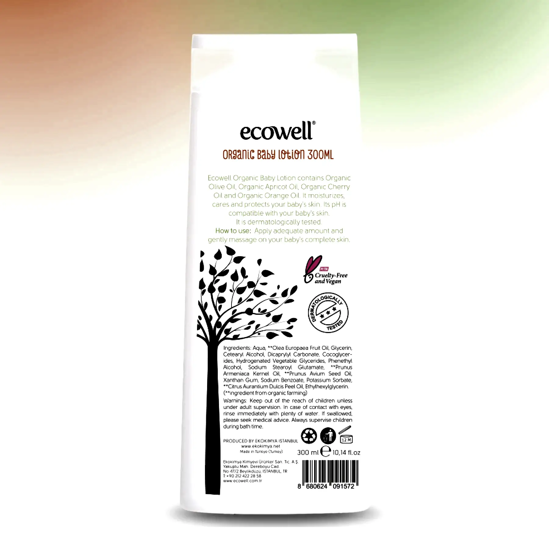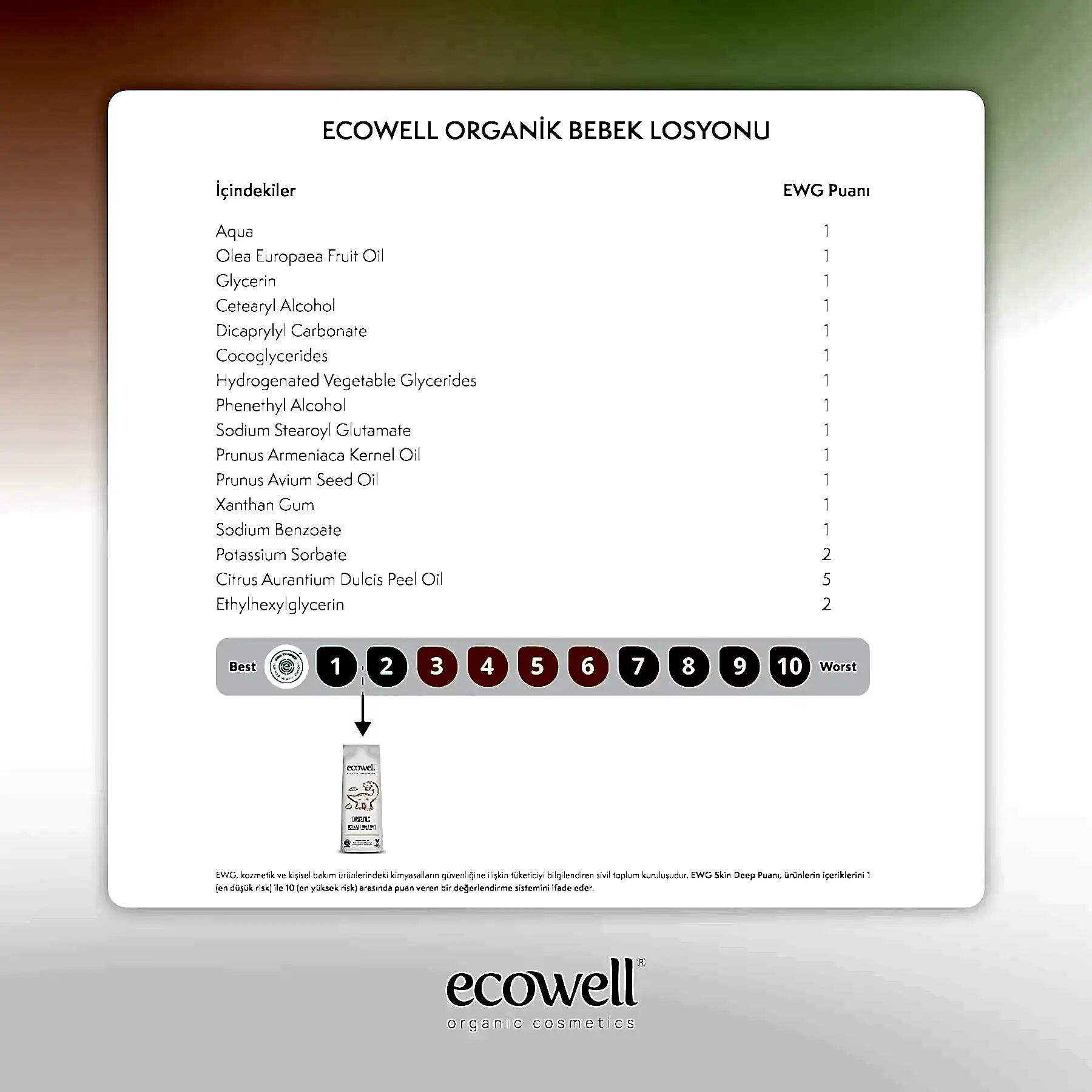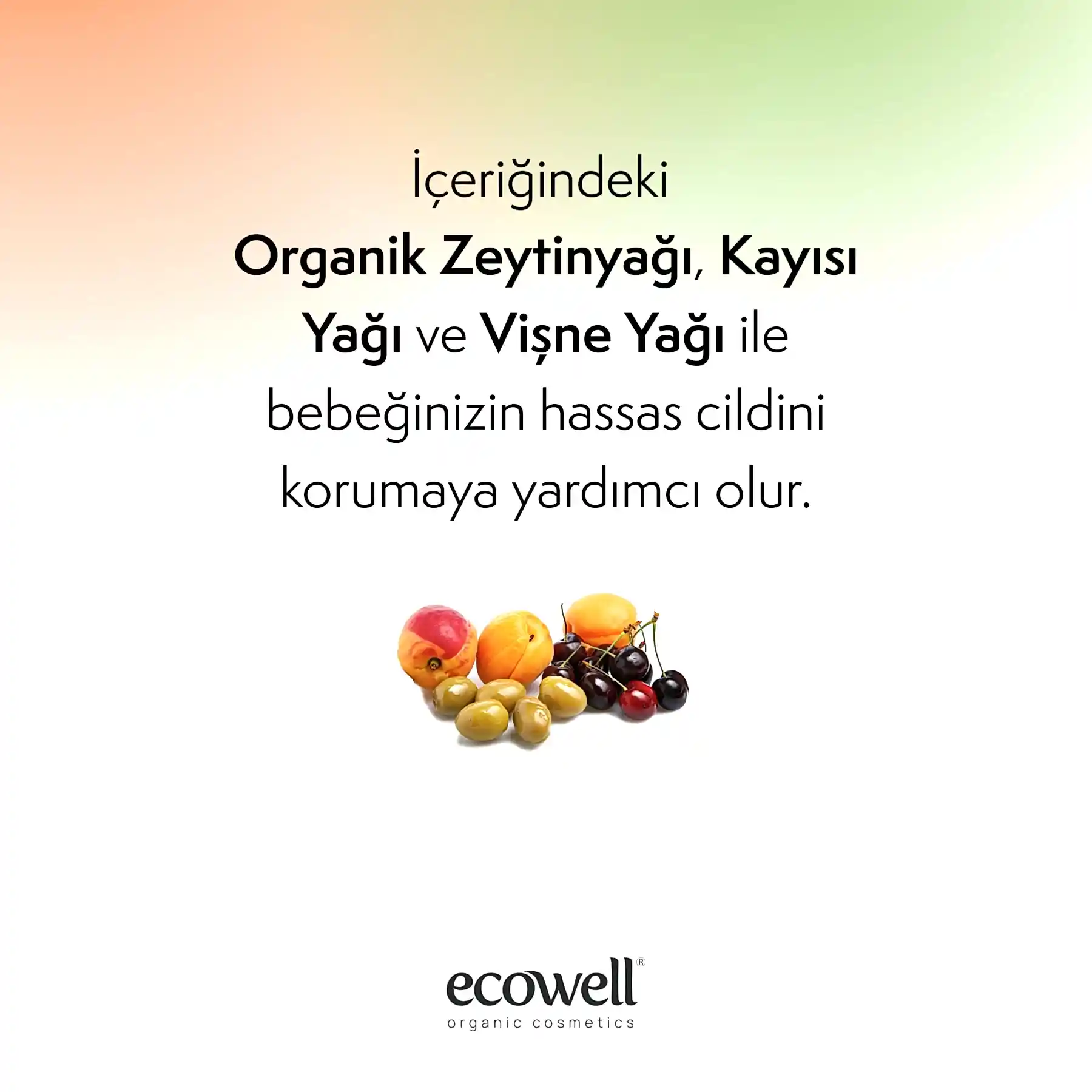 Ecowell Organik Bebek Losyonu, bebeğinizin hassas cildi için hafif ve hızlı emilen bir nemlendirme sağlar. Organik zeytinyağı, kayısı yağı, portakal yağı ve vişne yağı içeren formülü, cildin nem dengesini korur ve yumuşacık bir his oluşturur.