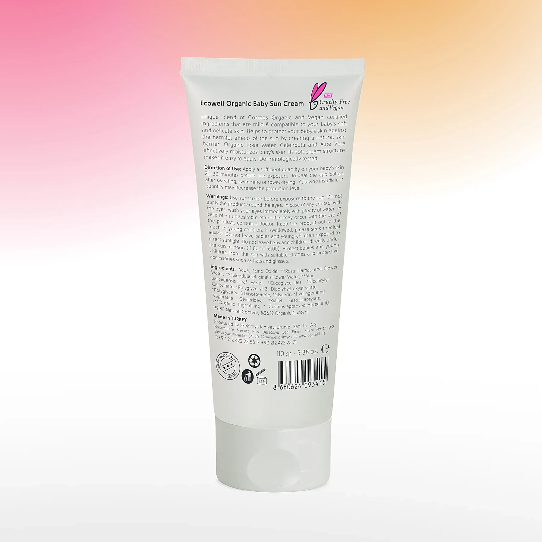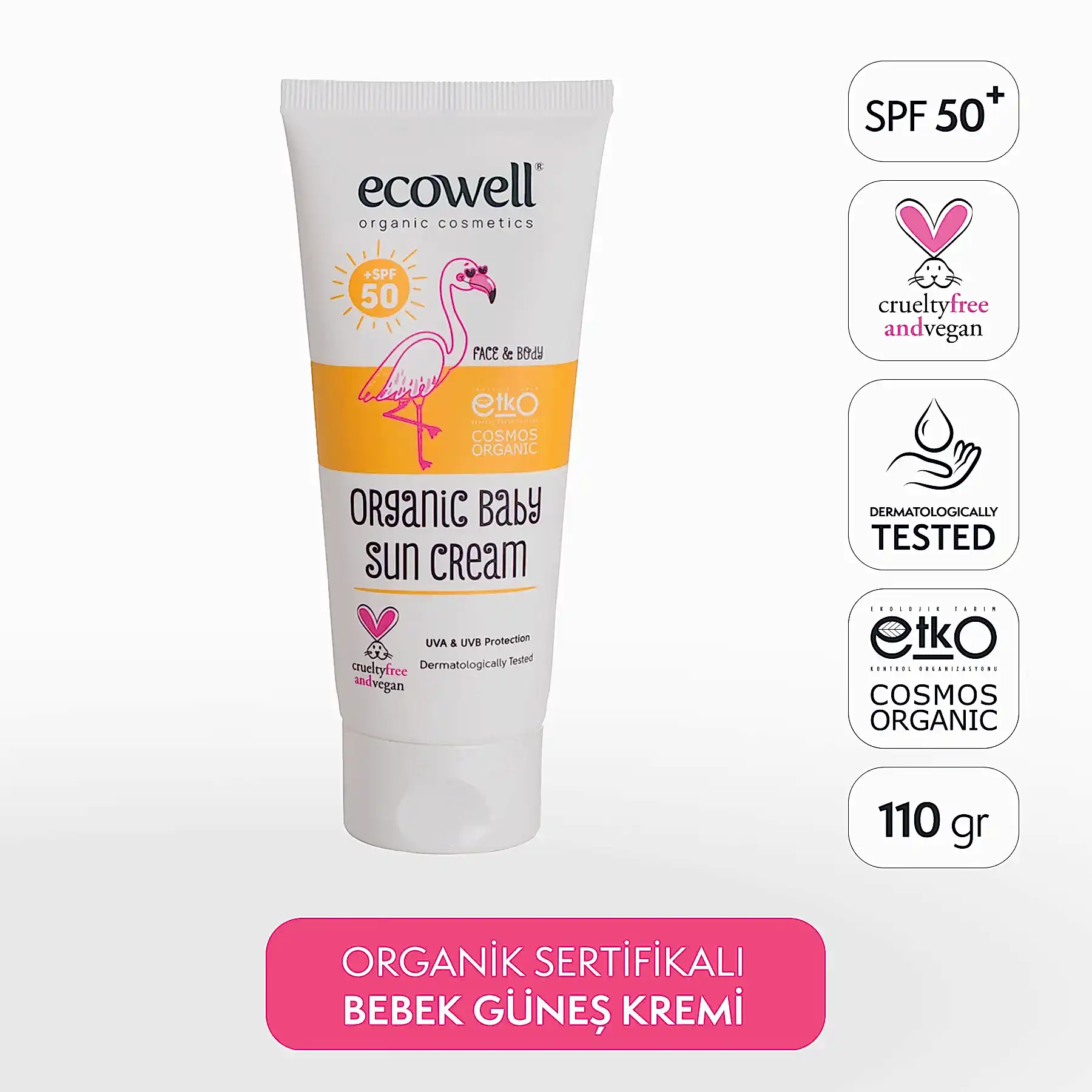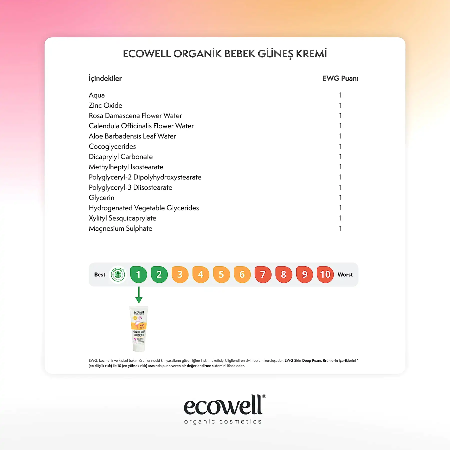 Ecowell Organik Bebek Güneş Kremi SPF 50, mineral filtrelerle güçlendirilmiş içeriği sayesinde UVA ve UVB koruması sağlar. Organik aloe vera, aynısefa ve gül suyu içeren formülü cildi yatıştırır, nemlendirir ve güneş sonrası kuruluk hissini azaltmaya yardımcı olur.